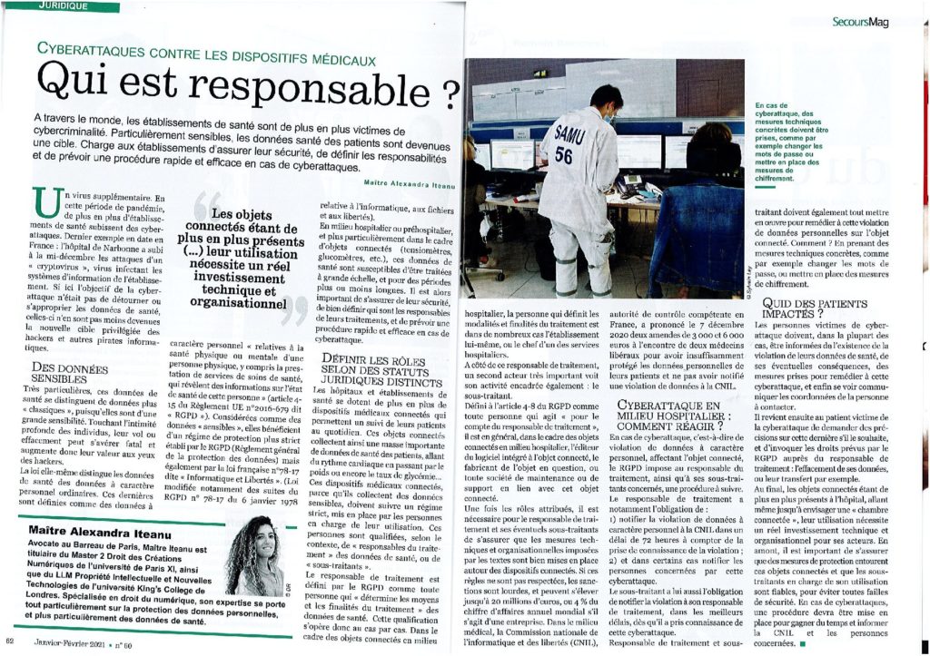 Alexandra Iteanu publie un article dans le magazine Secours Mag intitulé « Cyberattaques ontre les dispositifs médicaux, qui est responsable ?« , un thème de plus en plus souvent d’actualité.
